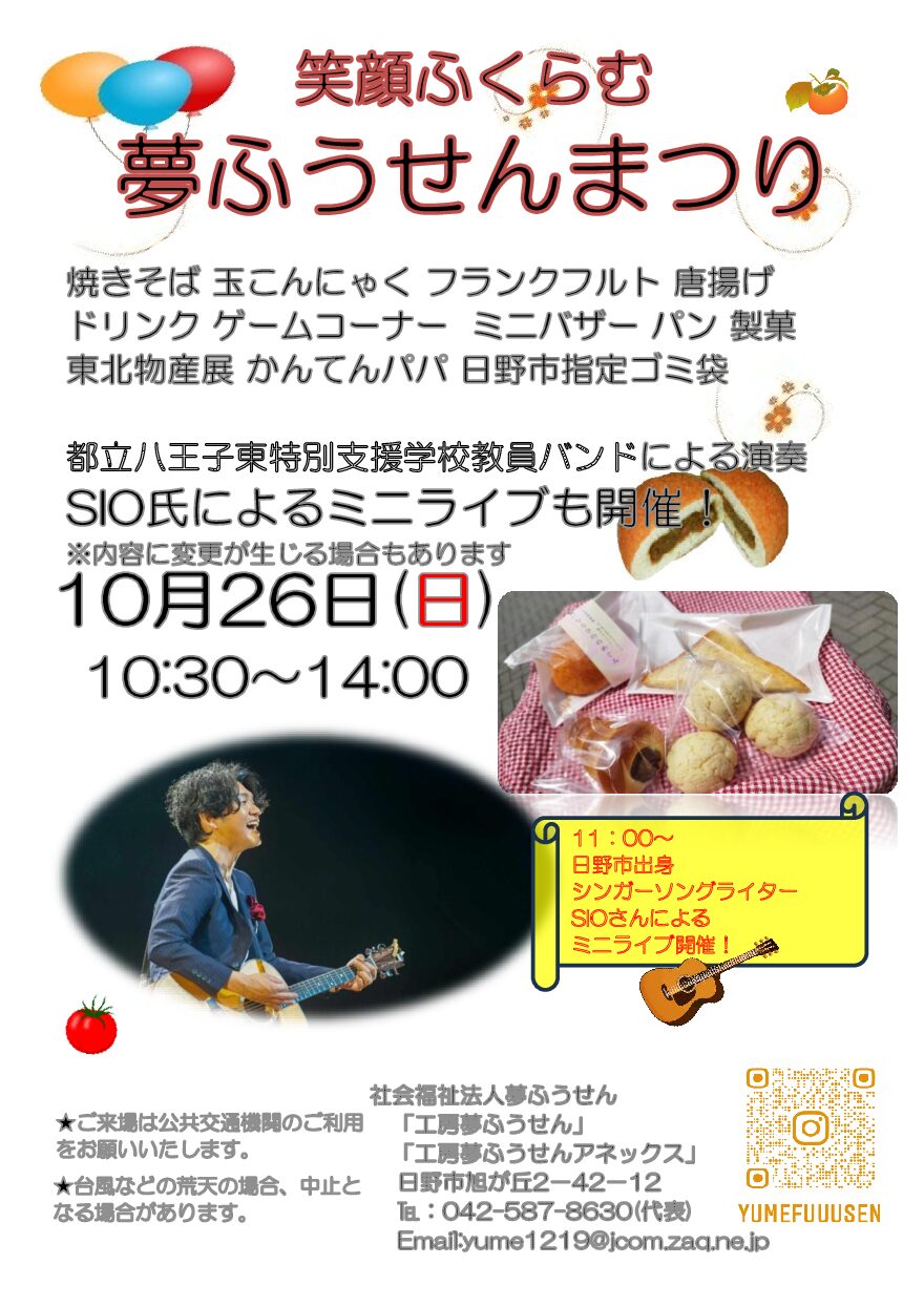 10月26日(日) 今年も夢ふうせんまつりを開催致します!日頃からご好評を頂いているパン・焼き菓子・自主製品の販売はもちろん、唐揚げ・フランクフルトなどの模擬店、ミニバザーなど盛り沢山の内容です!今年も日野市出身のシンガーソングライターSIOさん、そして八王子東特支の先生方によるライブもあります♪是非とも足をお運び下さい!